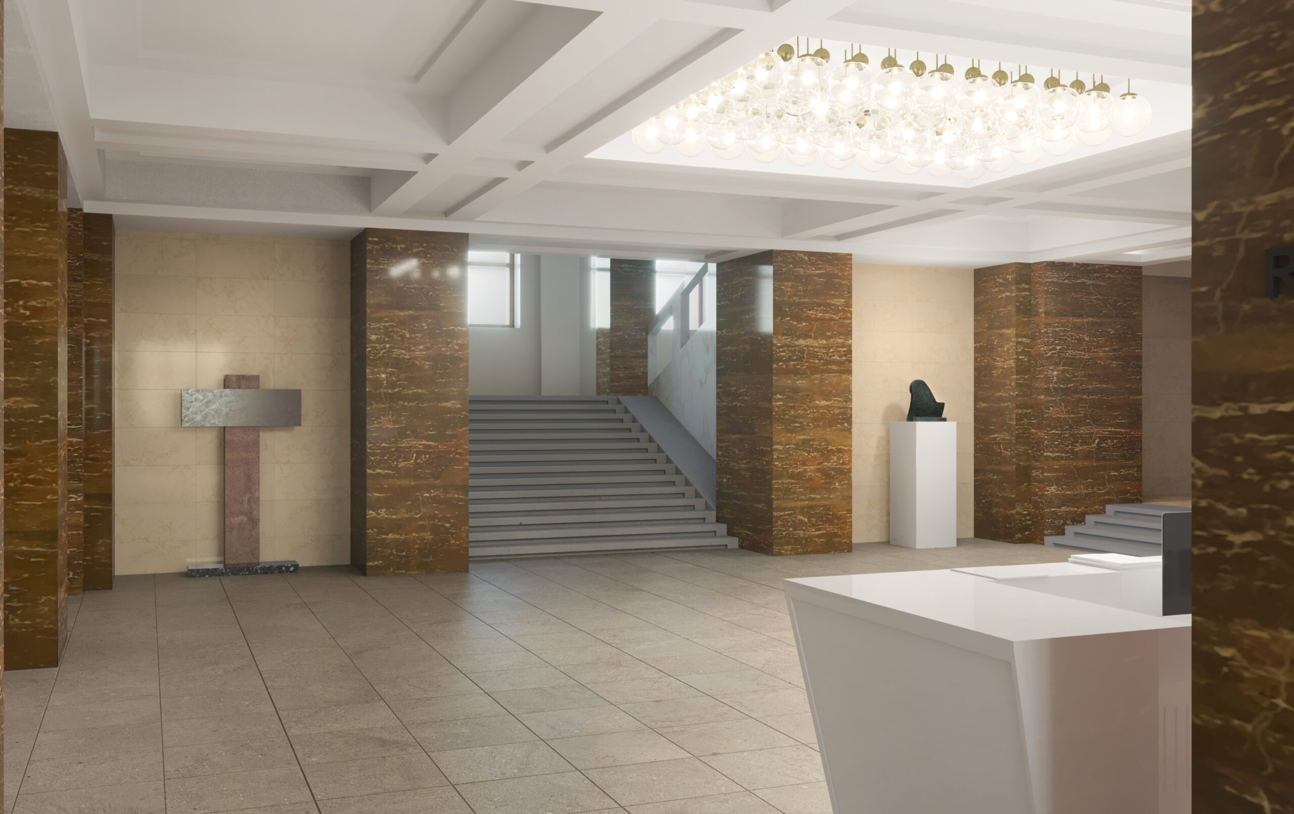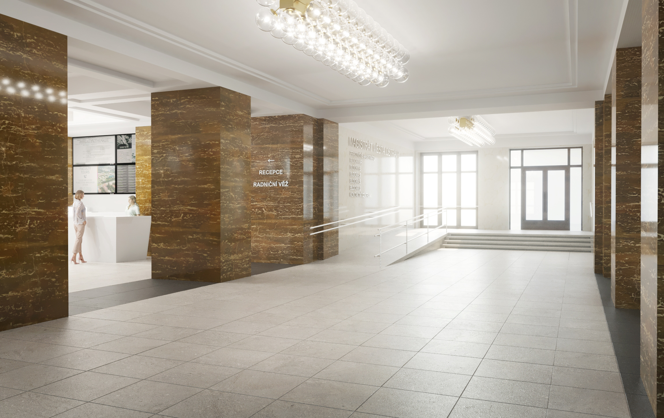 Studie představuje koncept řešení centrální recepce a jejího zázemí pro novou radnici Ostravy se sídlem Magistrátu města Ostravy. Jedná se o jednu z ikonických staveb Ostravy, která zaujímá důležitou součást v životě obyvatel města. Pro návštěvníky radnice bude nově používán pouze hlavní vstup do budovy, který je umístěn v ose hlavního průčelí z Prokešova náměstí. Boční vstupy budou sloužit pouze jako vstup pro zaměstnance a dále jako bezbariérový přístup do budovy. Návštěvníci tak budou vstupovat jednotně hlavním vstupem do budovy. Cílem projektu je podpořit architektonický výraz památkově chráněné stavby s citlivým zakomponováním návrhu, který nebude omezovat jiné funkce a aktivity v interiéru a vhodně dotvoří prostor.